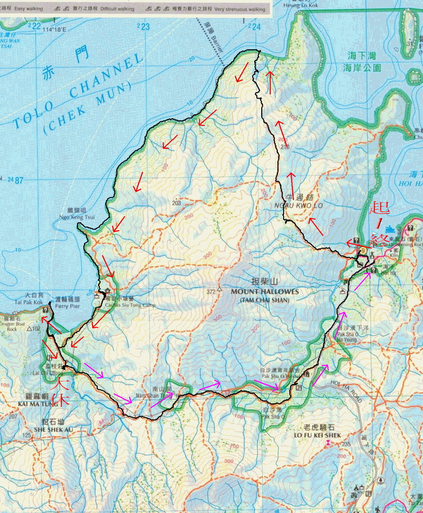 海下小巴站起步, 山路上牛過路, 過210m山頭, 北脊路落赤門海岸綑邊, 經鵝頸咀至明愛小塘營. 過荔枝莊大休. 休後經南山, 過白沙澳, 出海下路, 回海下小巴站乘車 20131217