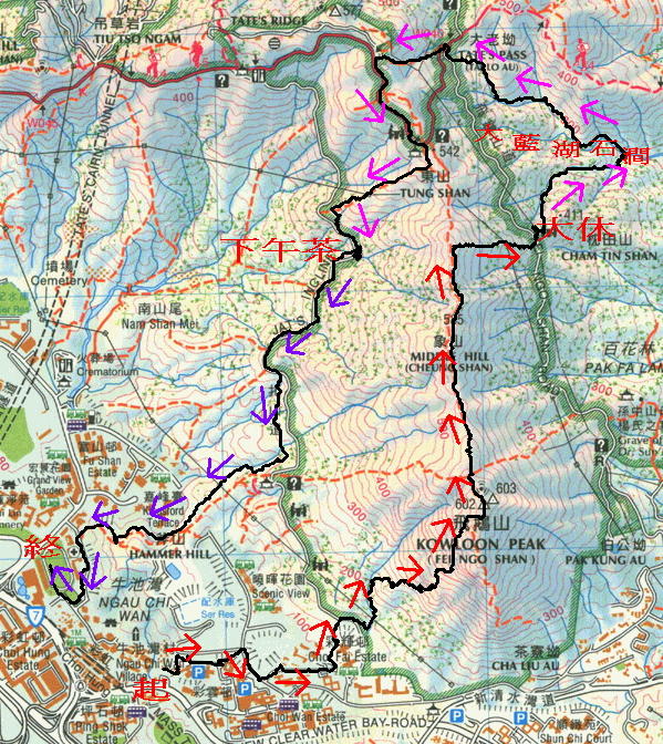 彩虹港鐵站B出口小巴站集合起步, 穿彩鳳徑, 過豐盛街, 走牛池灣街, 轉扎山道, 經扎山道晨運園, 西南脊路上飛鵝山頂(602m), 過象山(585m), 東脊山路落至飛鵝山道百花林亭大休. 休後下降大藍湖石澗左支至分源位轉上溯大藍湖石澗主澗至大老坳離澗. 走飛鵝山道, 轉走東山山路落扎山道, 往晨運園地下午茶. 茶後沿扎山道落山至一涼亭轉落晨運石級經斧山, 落至牛池灣斧山道運動場洗白白