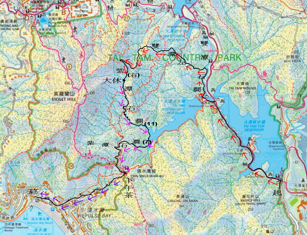 西灣河地鐵站出口乘14號巴士至大潭郊野公園站落車起步, 經大潭篤水塘至第4度橋轉左經大潭中水塘水壩接山路入澗上溯雙潭石澗至分源位轉左源. 窮源接山路中途左穿林入澗下降紫潭石澗11號右源至分源位大休. 休後續下降紫潭石澗11號至大潭中水塘邊. 右接小徑至紫潭石澗7號上溯至引水道離澗. 左走至衛奕信徑2段落淺水灣坳紫崗橋下午茶. 茶後小徑落南灣坊, 接南灣道, 出淺水灣道260號巴士淺水灣別墅站乘車