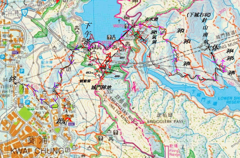 (14.2km)安蔭村巴士總站集合起步, 穿安蔭村出安捷街, 轉右入大尾村信箱旁小徑穿上一村及城門上村接城門道. 右往城門燒烤區4號燒烤場走麥徑6段, 中途轉左林中山路至一電塔開始醉酒灣防線之遊 - 暢遊城門陣地- 401, 402, 403, 404機槍堡及炮台偵察堡. 最後過401機槍堡接山路落衞奕信徑6段. 左走出接麥理浩徑7段. 右走上城門水塘大覇. 霸中間石級落雙城峽, 途中往左邊探2條去水道. 雙城峽左邊山路出接馬路至分岔位轉左路上至針山南坑(下城右坑)口大休. 大休後入澗落少少遊仁興4號礦洞. 回馬路落至分岔口上路旁石級往遊仁興6&5號礦洞. 回馬路上斜至涼亭前轉右邊山路往遊仁興8號礦洞, 繼沿山路上往仁興3&2號礦洞. 針山林中腰路往左走出接麥徑7段. 左落城門道, 過城門水大壩, 往麥理浩徑第6段出入口4號燒烤場下午茶. 茶後回城門道左走, 轉左邊石級落山經上一村, 穿安蔭東村, 出大白田街, 轉大白田徑, 往鄧肇堅體育館洗白白
