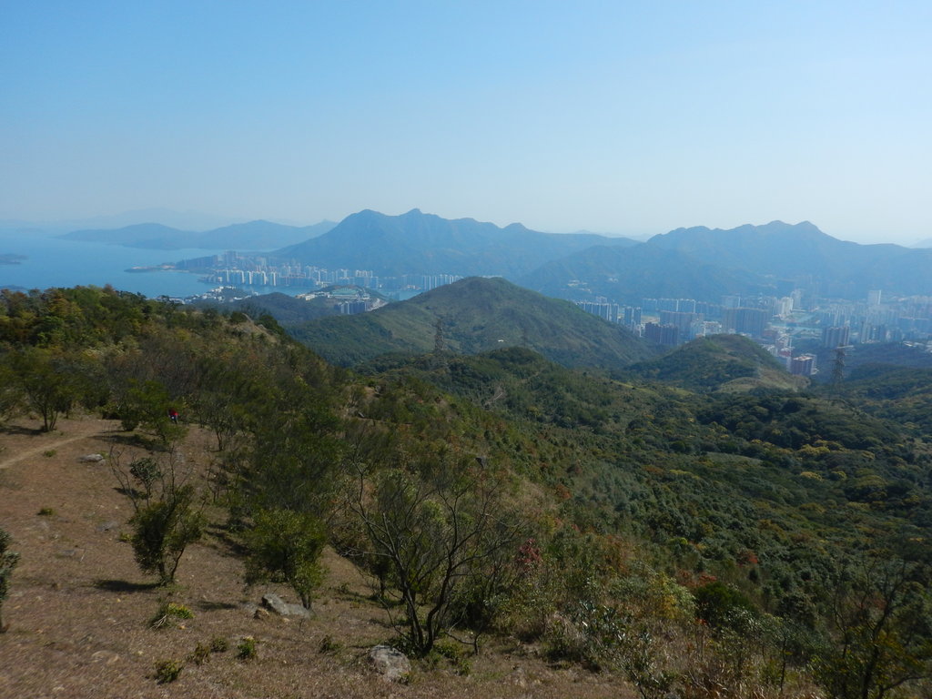 往右見馬鞍山, 彎曲山, 大金鐘, 石芽山及水/黃牛山一帶(左至右), 似乎隱約可見蚺蛇尖添(馬鞍山背後) DSCN4589