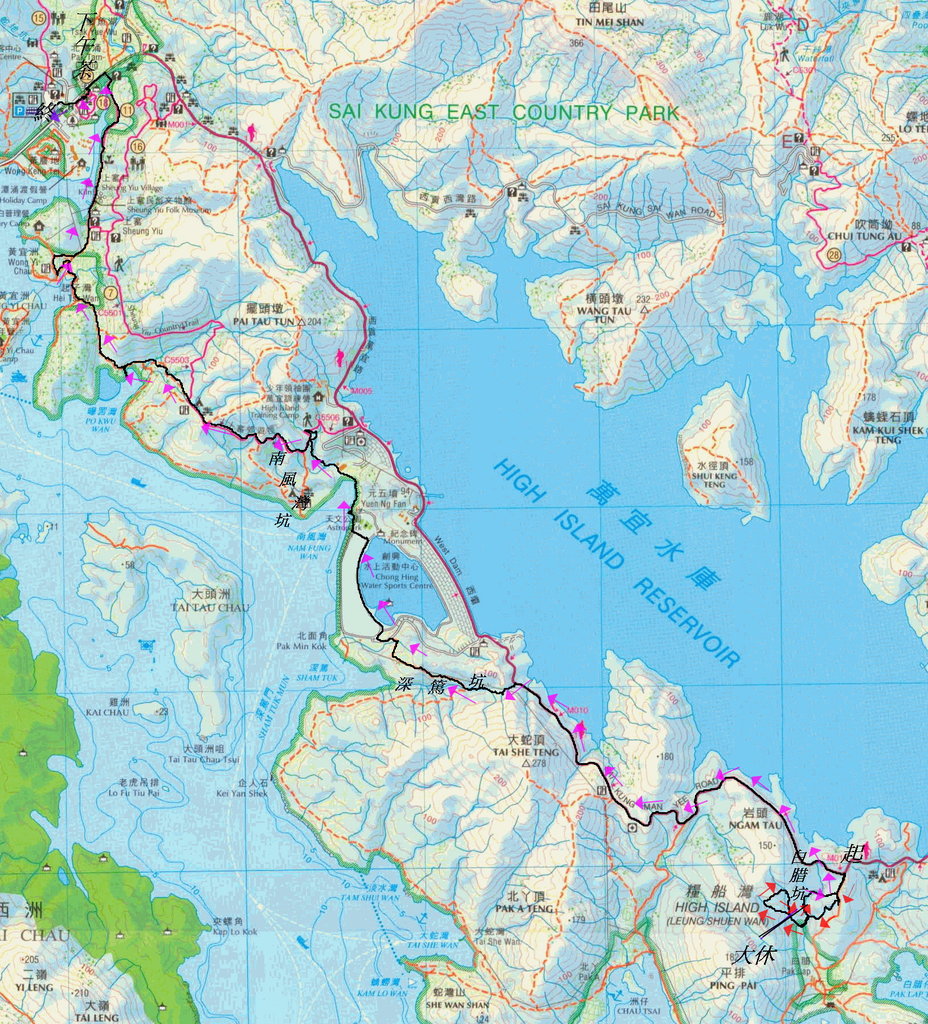 (12.7km) 西貢市中心乘計程車至萬宜路白腊村口落車起步, 走白腊村路落村中途右穿林入澗下降白腊坑右源右支右源至第2個分源位轉右上溯白腊坑右源左支左源. 至源末林帶打右穿林入澗下降白腊坑右源左支右源. 又至第2分源位轉左上溯白腊坑右源右支左源, 澗中水源位大休. 休後續沿坑上一段後便往右穿林接回白腊村村路. 左上至麥理浩徑1段(西貢萬宜路). 沿馬路左走至過M010 標柱後彎位轉左穿林入澗下降深篤坑至大蛇頂腰路離坑右走出創興水上活動中心馬路. 過活動中心至涼亭分岔路轉左落經元五墳出南風灣. 沿南風灣海邊路走過排洪管後便轉右穿林入澗上溯南風灣坑至上?郊遊徑. 左走至分岔路接左邊的起子灣村路經曝罟灣, 穿起子灣至黃宜洲村口轉右走出接上?家樂徑. 左走出大網仔路(麥理浩徑1段). 又左走至北潭涌傷健樂園燒烤場下午茶. 茶後回大網仔路左走至北潭涌巴士總站乘車散隊 20170518