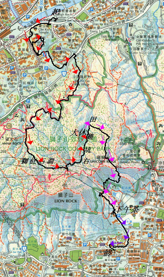 (11.5km) 馬鐵車公廟站B出口集合起步, 走車公廟路經車公廟. 左穿翠田街至愉景花園前轉左穿新田村接山路上秦石頂(78m). 往西落山穿新田村回出翠田街左走. 穿愉景花園出沙田頭路右走至獅子山隧道公路左走, 上天橋過公路後右走. 穿沙田頭新村接山路上接衞奕信徑5段右走. 接紅梅谷自然教育徑左上中途入澗上溯獅紅石澗至麥徑5段. 穿林入澗下降雞胸北(田雞)坑右支至適當水位大休. 休後續沿澗下降, 中途轉右穿林上接麥徑5段左走至雞胸山. 下降雞胸南崖接雞腰路石走至廢礦場. 出沙田坳道往法藏寺旁下午茶. 茶後沿沙田坳道落斜, 中途右穿竹園北村落竹園道. 右往竹園體育館洗白白