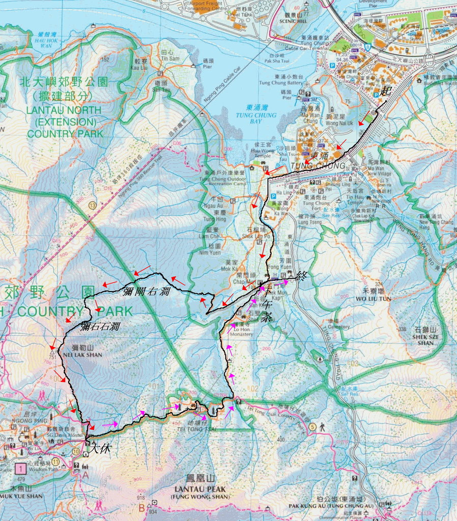 (11.8km) 東涌消防局集合起步, 走裕東路, 接松滿路, 過鳳大北坑溝位上接村路左走至石門甲村. 石門甲道盡處接右邊村路至盡處橋位入澗上溯彌閘石澗右源至金腰帶. 左走中途轉右入澗上溯彌石石澗上源. 窮源踏草坡上彌勒山頂(751m). 往南落山接彌勒山郊遊徑/鳳徑4段左走, 至金腰帶右走, 落昂平營地大休. 休後沿法門古道落至石門甲村大隊于此下午茶. 無等大隊沿石門甲道出東涌道羅漢亭乘巴士出東涌市中心 20191022