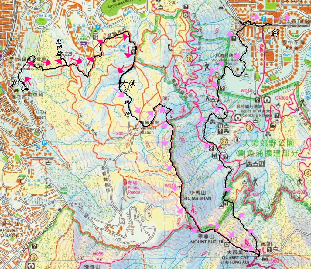 (10.3km) 港鐵天后站集合起步, 走銅鑼灣道, 穿蓮花宮西街至蓮花宮. 宮旁石級上天橋往勵德村巴士總站接走怡景道. 中途右接山路上紅香爐(228m). 落金督馳馬徑左走至一涼亭轉右山路經自悠亭往小馬坑破邊石旁大休. 休後上溯小馬坑至無線電站. 接走衞奕信徑2段, 過小馬橋, 登小馬山. 接走港島徑5段登畢拿山(417m)落大風坳. 接柏架山道落英皇道. 右往港鐵太古站乘地鐵