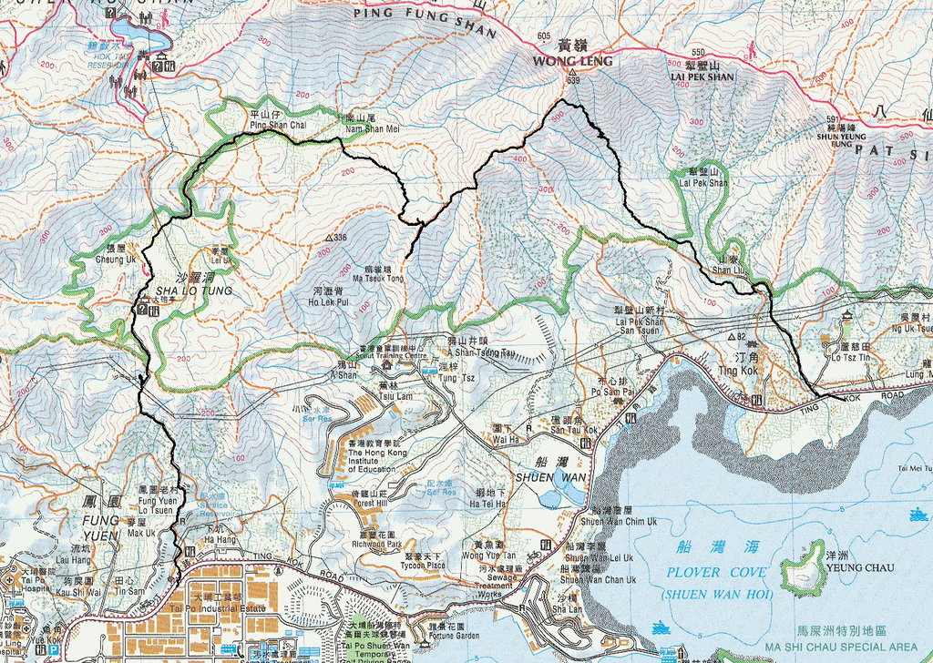大埔火車站乘75K巴士, 山寮站下車起步, 上溯黃嶺南坑左源, 離澗草坡上山脊後轉左落山至往洞梓山路前轉右, 小路入澗下降黃鶴石澗中游至平山仔離澗, 山路至沙羅洞, 出大炮亭接石屎路落山至一水坑位下午茶, 茶後沿石屎路落山至下坑配水庫附近轉左入荒涼舊村路經下坑村出至汀角路乘巴士回大埔火車站 20080717