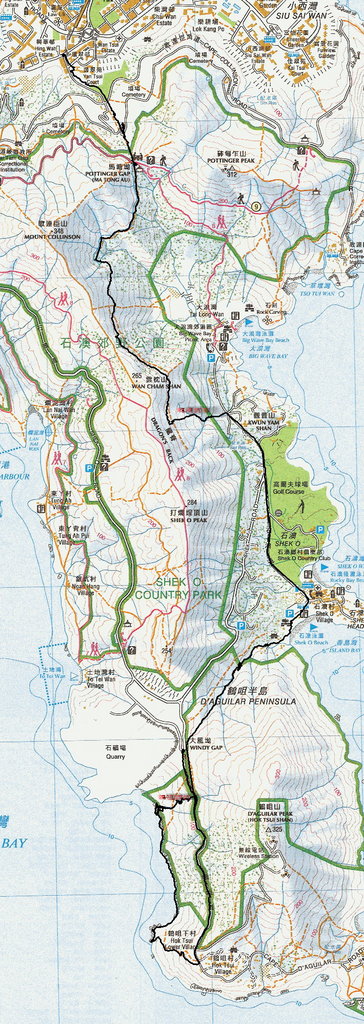 筲箕灣乘9號巴士至大風坳下車起步, 入鶴咀道, 半路玩石室石河, 續行鶴咀道, 轉右入小路落海邊廢堡, 綑邊至礦場前46號澗(鶴咀西坑?), 上溯至鶴咀道, 轉左行至大風坳, 山路接入石澳坑下降, 坑中大休. 休後續下降石澳至石澳沙灘, 石澳道接大浪灣道, 13號豪宅對面入澗上溯龍浪坑至龍脊山腰路. 轉右沿山腰路行至引水道, 出馬塘坳小休下午茶. 茶後經柴灣墳場出柴灣散隊