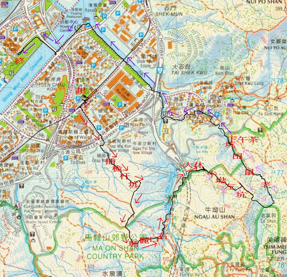 馬鐵第一城站A出口集合起步, 走銀城街, 接多石街, 穿插桅杆村至橋位轉左接拜山小徑, 中途入澗上溯插桅杆坑. 打左離澗踏草坡上接山脊路轉右沿山脊走一段後穿林下降馬麗口右坑至來往觀音山村及大老山隧道口的馬路. 落引水道, 于一晨運地大休. 休後引水道盡頭入澗上溯牛坳左坑, 中途打左離澗上接山脊路轉右走一段後穿林落老鼠田入澗下降老鼠田坑. 至澗口晨運地下午茶. 茶後離澗穿廣林苑, 過廣源村, 接廣善街, 經牛皮沙街, 轉河邊小徑, 經小瀝源路遊樂場至明星海鮮舫. 過城門河第二海濱花園, 上火炭路過城門河後轉左入沙田運動場洗白白