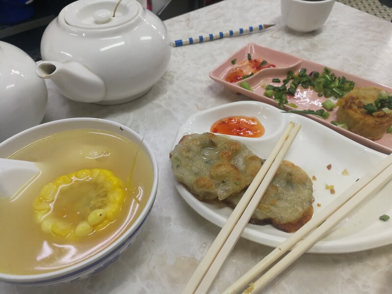 炸魚餅及桂花卷,後者其實是炸山筋