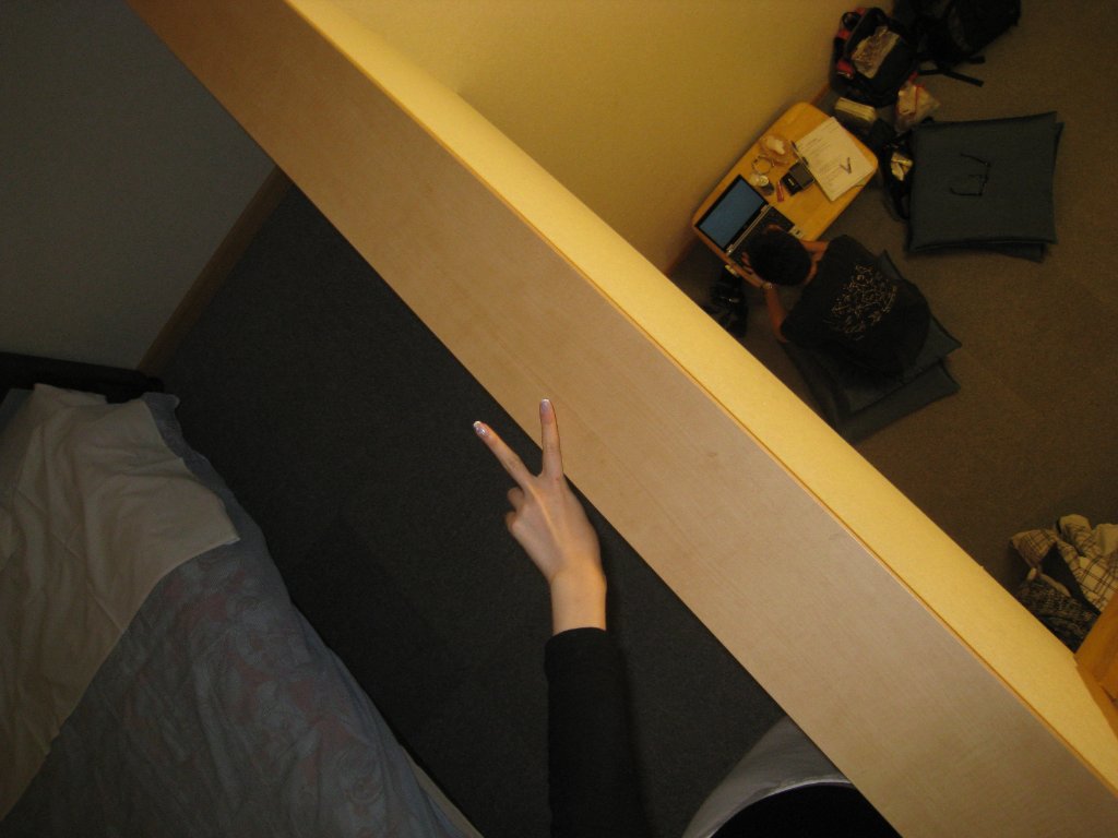 我們可選擇在樓下舖地舖瞓, 或者在閣樓瞓床, 懶得舖又唔想整污糟,就選閣樓呢,呢張相好得意~在天花板影下來的,好高啊~早抖喇!聽日一早去睇流水喇!!