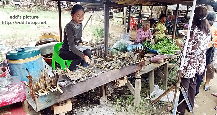 之後到一個很悶的購物點, 賣紅寶石的, 全沒興趣, 在此不作介紹. 吃完中午飯, 要開始乘坐 6個小時的車程了, 這個長程是由金邊到暹粒, 距離只有 314公里, 何解需要 6個小時呢, 由於部份路段還未修好, 路況很差, 以及柬埔寨的高速公路, 只有雙線雙程, 路上使用者以駕駛電單車居多, 大車的行駛速度不能太高, 還要經常越線扒頭, 這 6個小時確實漫長. 導遊安排了每兩個小時停一次休息站, 在休息站終可看見一架搭載當地人的長程巴士, 難得一見呢. 而這種休息站是沒有冷氣設備, 洗手間衛生尚可. 至於小販售賣的東西, 以食物為主, 當中最能令我著眼的, 是炸草蜢和炸蜘蛛.