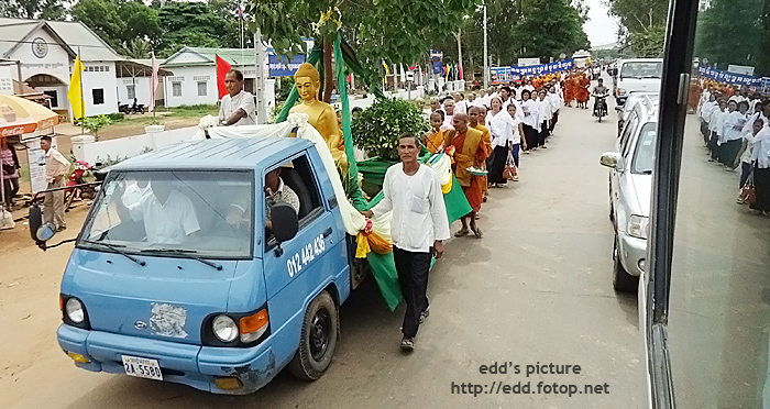 吃過午飯後, 又要開始 6個小時的車程回到金邊, 路上遇見一班佛教徒及僧侶, 隨著佛像遊行.