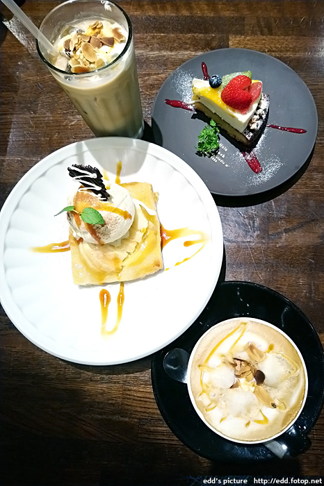 4 kinds of berry tart,apple pie with vanilla icecream,hot cappuccino,ice honey coconut latte。