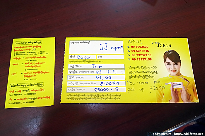 預訂車票為明天晚上八時開出的夜行巴士,由仰光前往蒲甘,二人 50000ks,包快遞公司至長途巴士總站的接送。