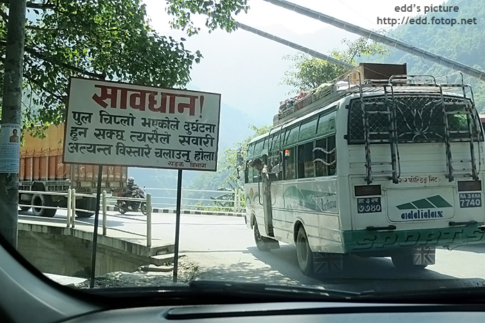 Day 07 早上開始乘長程車回程加德滿都, 經過兩個半小時車程後, 又到 Riverside Spring Resort 吃午餐. 尼泊爾的公共巴士有一位售票員跟車, 無論巴士在市內或公路行駛, 他都會站在不關上的車門旁邊, 很驚心.