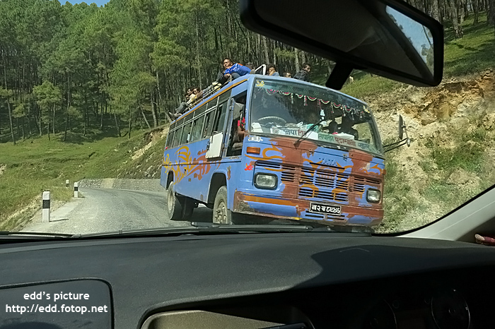 9am Check-out 出車前往 Namo Buddha, 未段的路況極差, 時有遇見超載的公車, 很驚險.