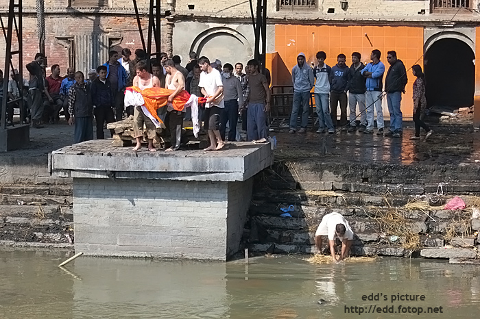 Pashupati Temple 是一間 Hindu 教寺廟. 當有家人過身後, 家屬到政府辦理死亡手續和與寺廟預約火化時間. 火化當日的過程如下 :