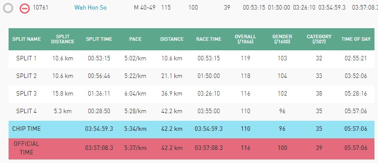 Eddie :: 30th Bangkok Marathon Nov19, 2017 :: 上半1:50, 下半腳跌至2:05. Time_split