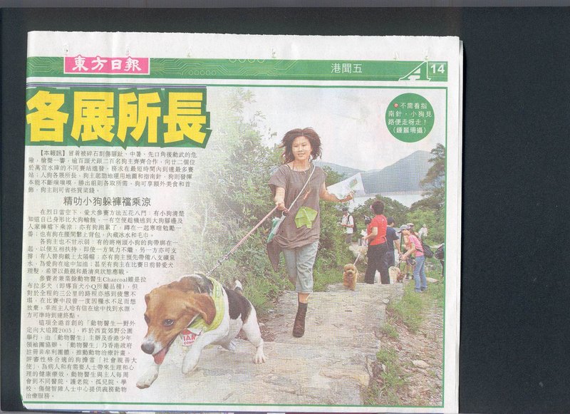 冒 被 碎 石 割 傷 腳 趾 、 中 暑 、 先 口 角 後 動 武 的 危 險 , 槍 聲 一 響 , 逾 百 頭 犬 跟 二 百 名 狗 主 齊 齊 合 作 , 向 廿 二 個 位 於 萬 宜 水 庫 的 不 同 賽 站 進 發 , 務 求 在 最 短 時 間 內 到 達 最 多 賽 站 ; 人 狗 各 展 所 長 , 狗 主 起 勁 地 運 用 地 圖 和 指 南 針 , 狗 則 發 揮 本 能 不 斷 嗅 嗅 嗅 , 勝 出 組 則 各 取 所 需 , 狗 可 享 額 外 美 食 和 首 飾 , 狗 主 則 可 省 些 買 菜 錢 。 精 叻 小 狗 躲 褲 襠 乘 涼 在 烈 日 當 空 下 , 愛 犬 參 賽 方 法 五 花 八 門 : 有 小 狗 清 楚 知 道 自 己 身 形 比 大 狗 輸 蝕 , 一 有 空 便 趁 機 逃 到 大 狗 腳 邊 及 人 家 褲 襠 下 乘 涼 ; 亦 有 狗 跑 累 了 , 蹲 在 一 起 寒 暄 勉 勵 一 番 ; 也 有 狗 在 腰 間 繫 上 背 包 , 內 藏 冰 水 和 毛 巾 。 各 狗 主 也 不 甘 示 弱 : 有 的 將 兩 頭 小 狗 的 狗 帶 綁 在 一 起 , 以 便 互 相 扶 持 , 即 使 一 方 氣 力 不 繼 , 另 一 方 亦 可 支 撐 ; 有 人 替 狗 戴 上 太 陽 帽 ; 亦 有 狗 主 預 先 帶 備 八 支 礦 泉 水 , 為 愛 狗 在 途 中 加 油 ; 甚 至 有 狗 主 在 比 賽 日 前 替 愛 犬 理 髮 , 希 望 以 最 靚 和 最 清 爽 狀 態 應 戰 。 參 賽 者 兼 業 餘 動 物 醫 生 Charcoal 雖 是 拉 布 拉 多 犬 ( 即 導 盲 犬 小 Q 所 屬 品 種 ) , 但 對 於 全 程 約 三 公 里 的 路 程 亦 感 到 疲 憊 不 堪 , 在 比 賽 中 段 曾 一 度 因 糧 水 不 足 而 想 放 棄 , 幸 而 主 人 哈 有 信 在 途 中 找 到 水 源 , 方 可 準 時 到 達 終 點 。 這 項 全 港 首 創 的 「 動 物 醫 生 ─ 野 外 定 向 大 追 蹤 2005 」 , 昨 於 西 貢 郊 野 公 園 舉 行 , 由 「 動 物 醫 生 」 主 辦 及 香 港 少 年 領 袖 團 協 辦 。 「 動 物 醫 生 」 乃 香 港 政 府 註 冊 非 牟 利 團 體 , 推 動 動 物 治 療 計 畫 , 評 審 性 格 合 適 的 狗 擔 當 「 社 會 親 善 大 使 」 , 為 病 人 和 有 需 要 人 士 帶 來 生 理 和 心 理 的 健 康 療 效 , 動 物 醫 生 與 主 人 每 周 會 到 不 同 醫 院 、 護 老 院 、 孤 兒 院 、 學 校 、 傷 健 智 障 人 士 中 心 提 供 義 務 動 物 治 療 服 務 。