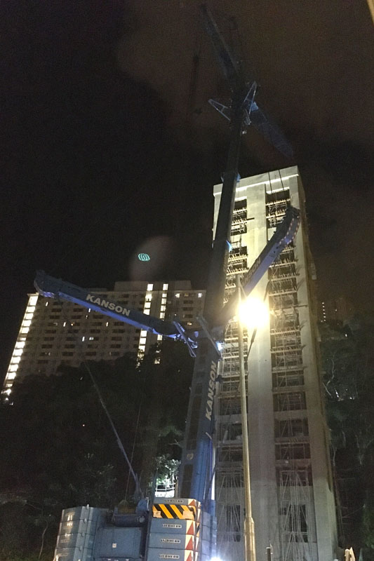 Kanson LTM1750-9.1 +31.5m luffing fly-jib lifting lower part of footbridge