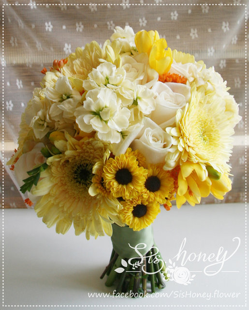 sis.honey :: Fresh Flower Bouquet 鮮花花球 :: 鮮花花球 主花:淺黃太陽菊 配花:黃色較剪蘭、奶白玫瑰、淺黃紫羅蘭、小太陽花