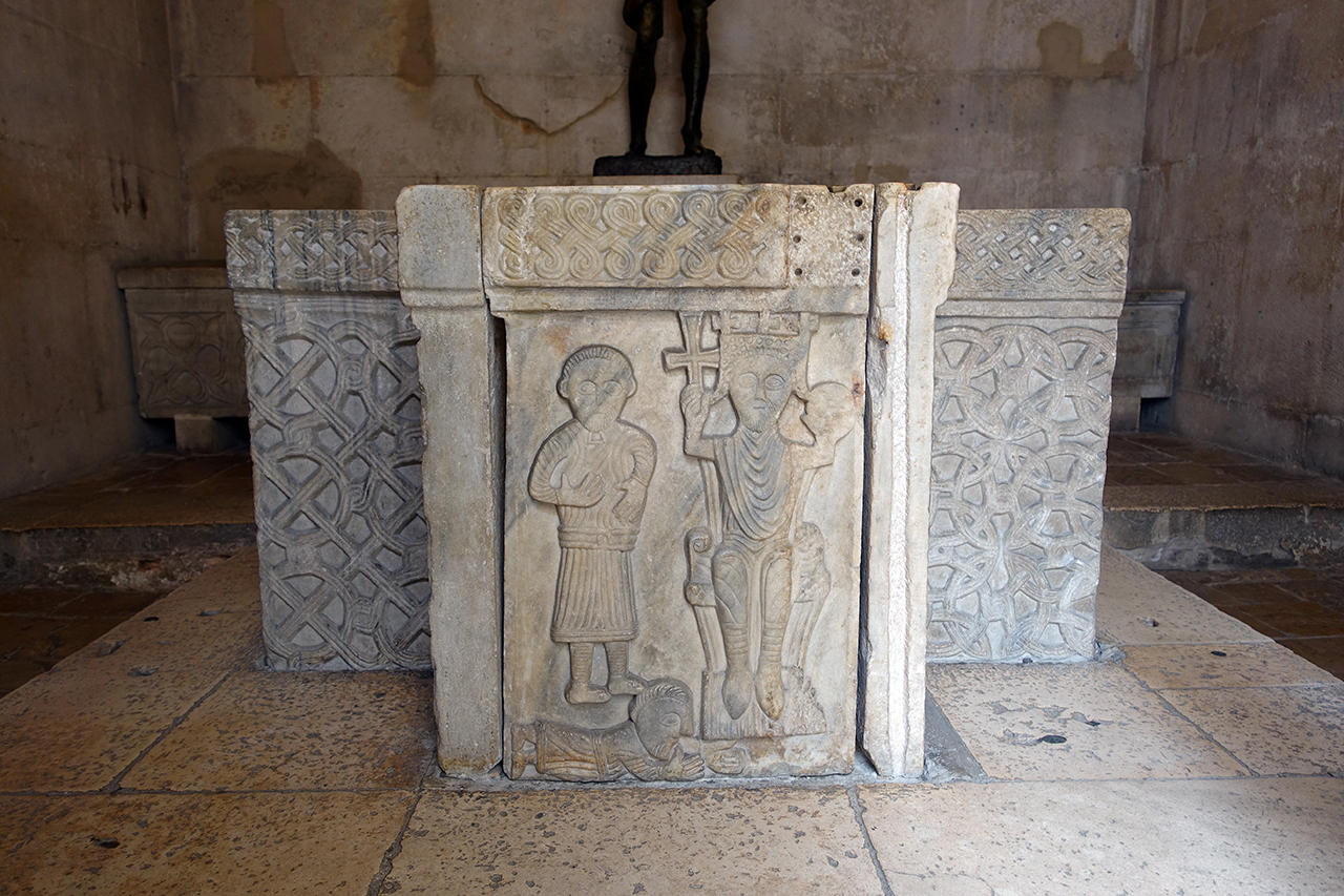 Inside the temple is the big 12th-century cross-shapped baptismal font. On the font, notice the engraving: a bishop (on the left) and the king on his throne (on the right)