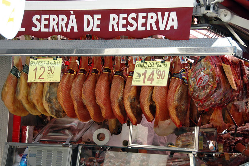 Vincent Poon :: Barcelona (04-07 July 2006) :: Ham store, Mercat de Sant Josep -- all the jambons are hung up for sale