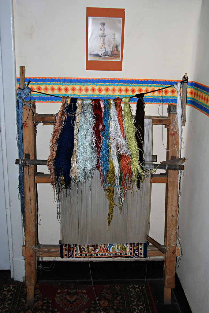 Carpet weaving machine. The coloured threads of silk are hung at the top. You can see a partially weaved carpet at the bottom