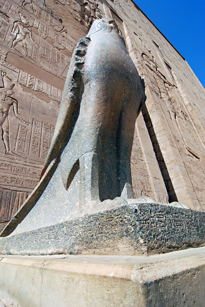 One of the two granite falcon statues guarding in front of the entrance of the temple