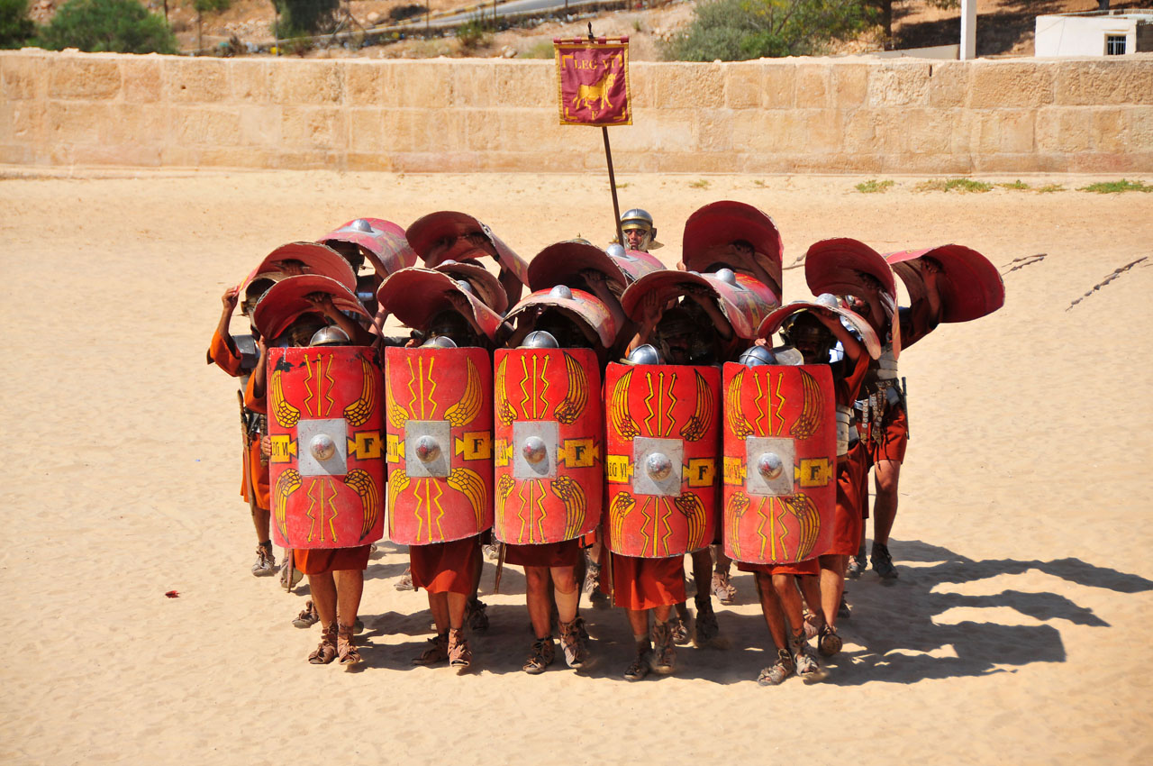 Forming the testudo formation, ie the turtoise formation during siege