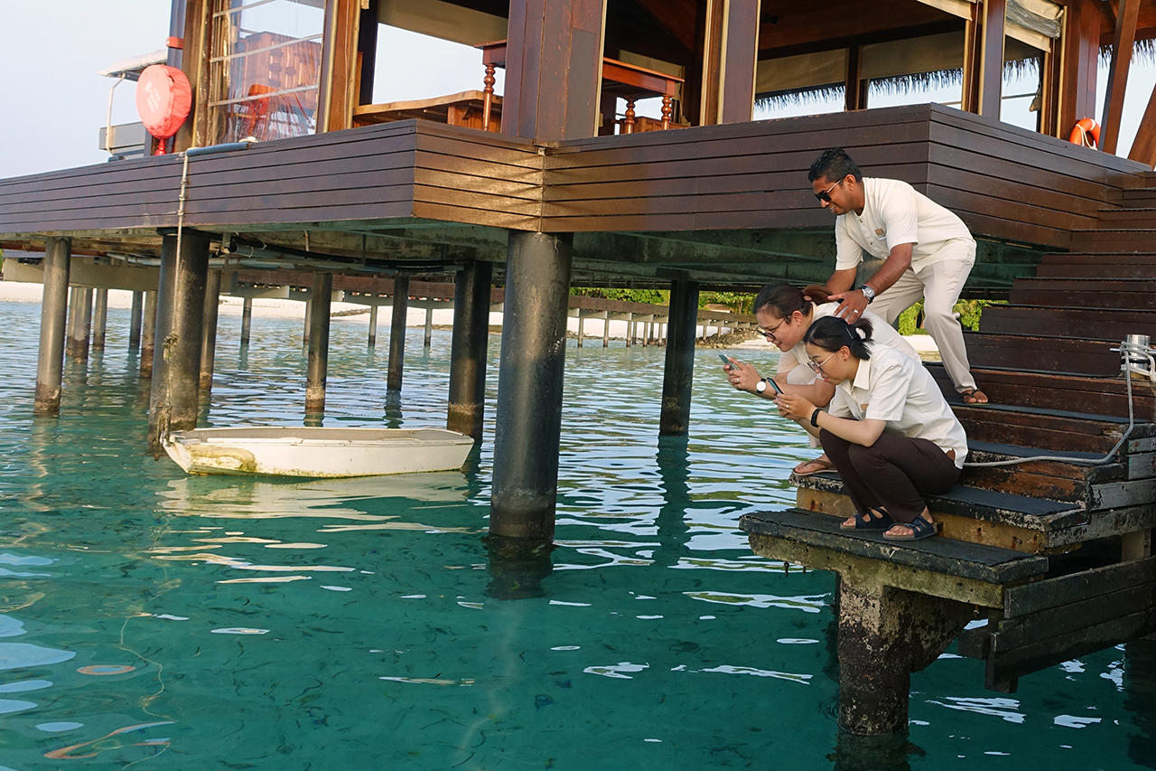 While waiting for us to depart the ladies attention was quickly focusing into the swimming squids in the water. At the same time, the guy behind had something else in mind though.