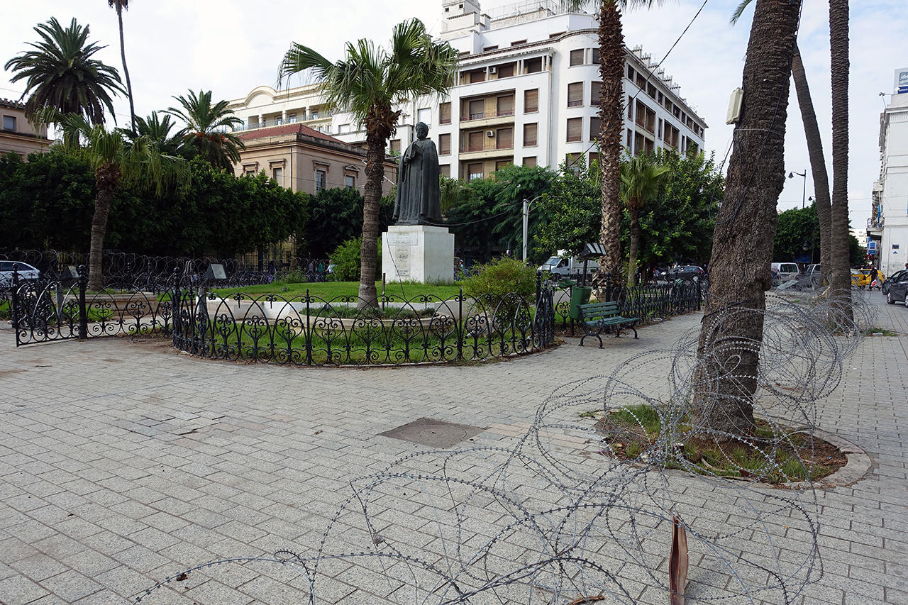 Statue of Ibn Khaldun, a great Tunis-born Islamic teacher and philosopher, but he was surrounded by barbed wires... is that how you pay respect to a great man?